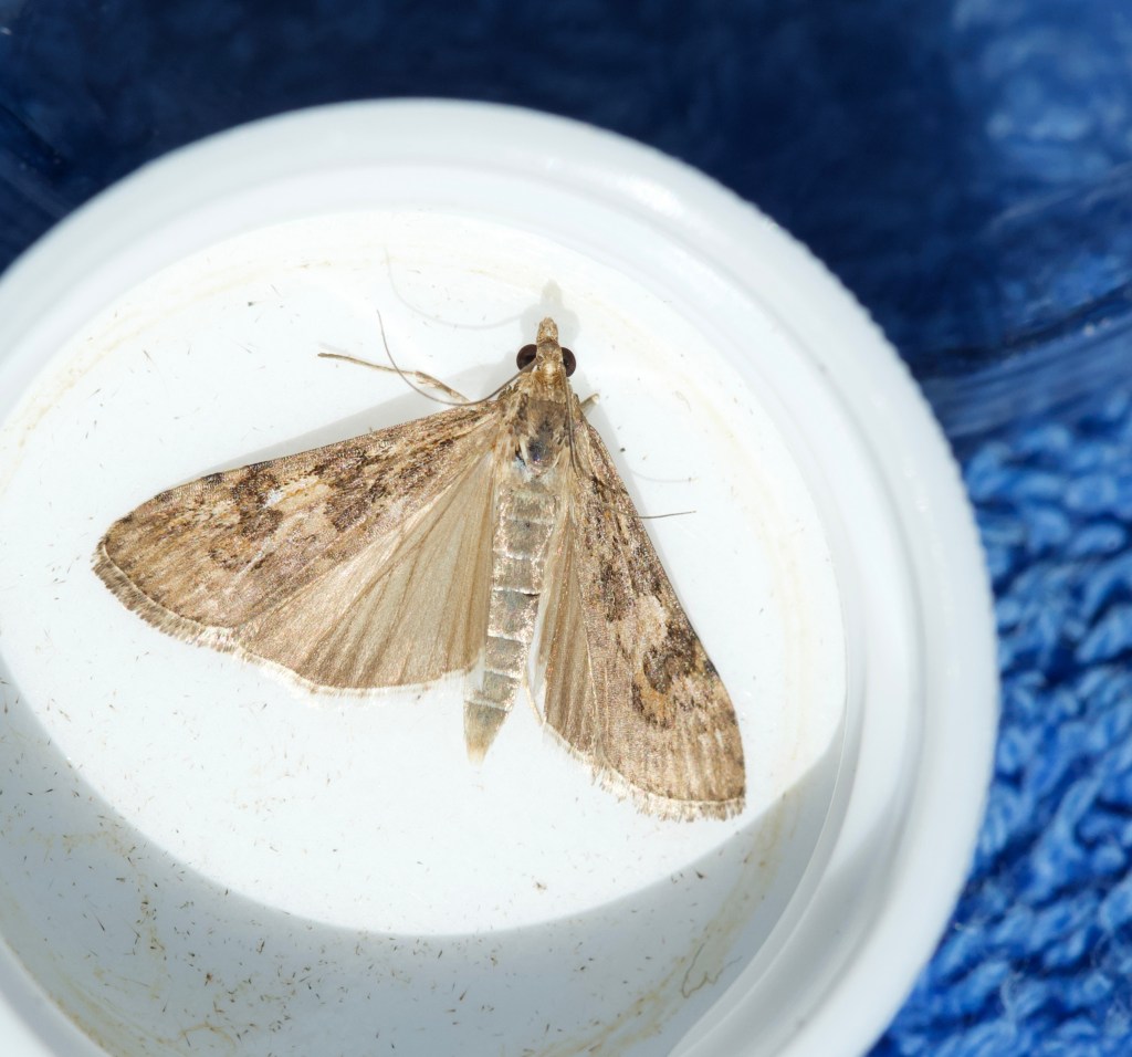 Other New For Garden moths included Double-striped Pug, Pandemis heparana – Dark Fruit-tree Moth, Eupocelia angustana, Celypha lacunana, White-shouldered House-moth – Endrosis sarcitrella and Agriphila geniculea. See photo below – reminiscent of The Clangers. Needless to say, with this list of mostly micro moths, Trevor was on hand to ID them. We were bird ringing this morning and I put the contents of the trap in a holding cage and took them with me. Most micros are a step too far for me. This is only my second year of recording, so the New For Garden records do not mean that the moth is unusual, just that they have not been recorded from my garden before now.