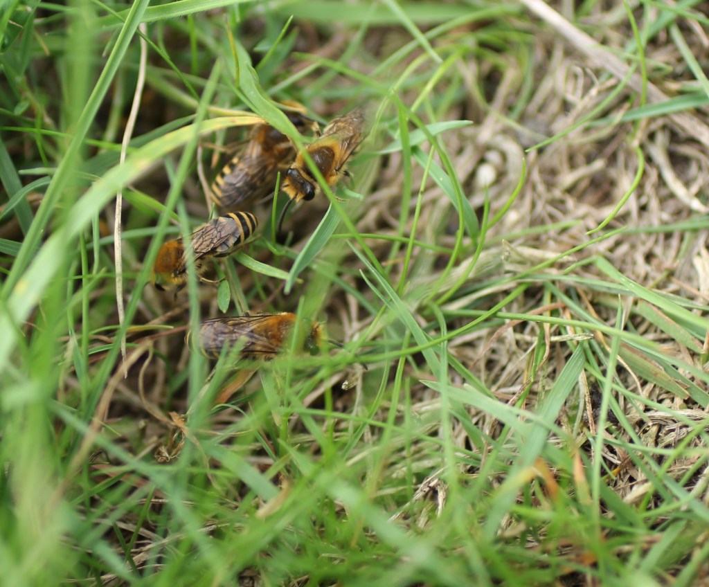 I have a grass path outside the front door and every year round about now Ivy Bees emerge from their underground nests. These will be the females as they hatch out a few weeks later than the males. The cat finds them very disconcerting as over thirty bees zoom around the grass at his ankle height. He avoids the path wherever possible, not realising that these bees are almost harmless. The males have no sting. The females do have a sting but rarely use it, the venom is much weaker than that of a honey bees and the Ivy Bee is far more even tempered.