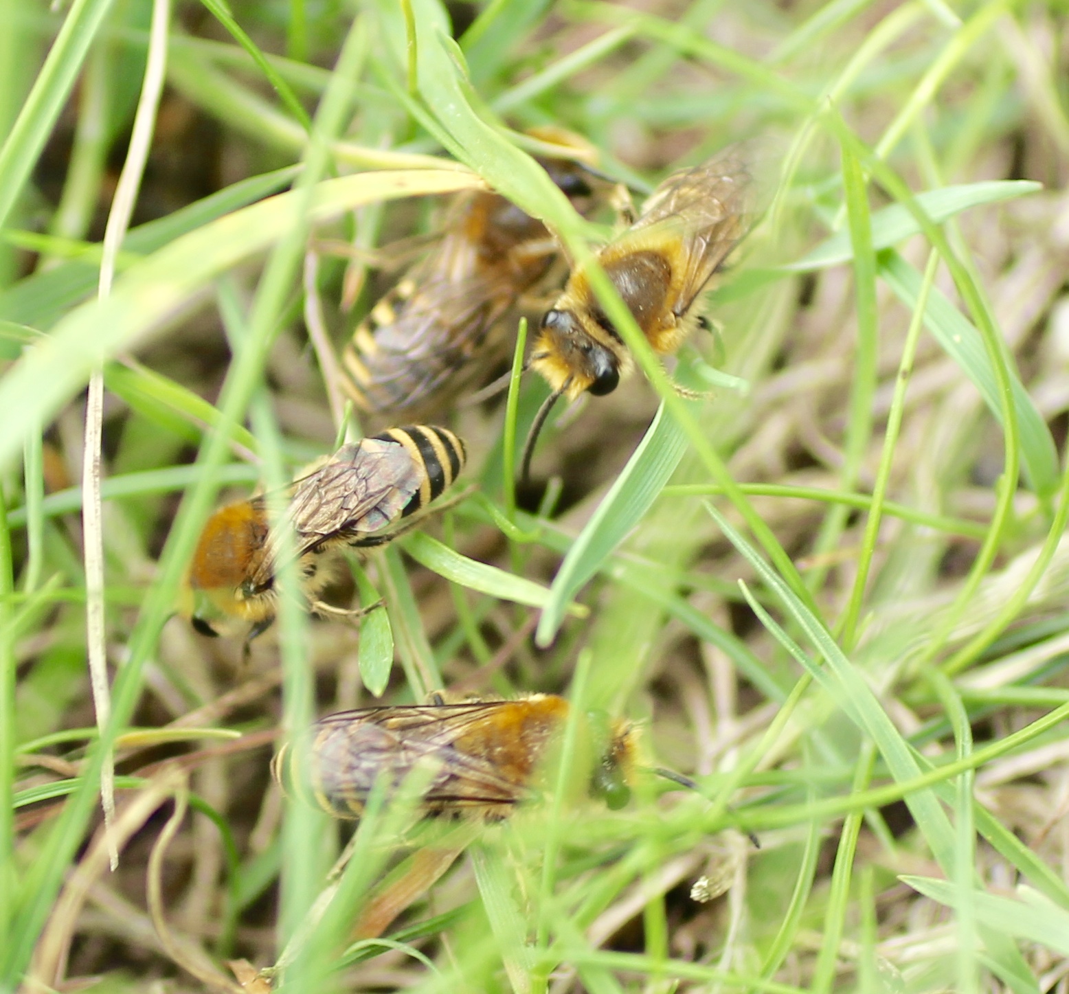 I have a grass path outside the front door and every year round about now Ivy Bees emerge from their underground nests. These will be the females as they hatch out a few weeks later than the males. The cat finds them very disconcerting as over thirty bees zoom around the grass at his ankle height. He avoids the path wherever possible, not realising that these bees are almost harmless. The males have no sting. The females do have a sting but rarely use it, the venom is much weaker than that of a honey bees and the Ivy Bee is far more even tempered.