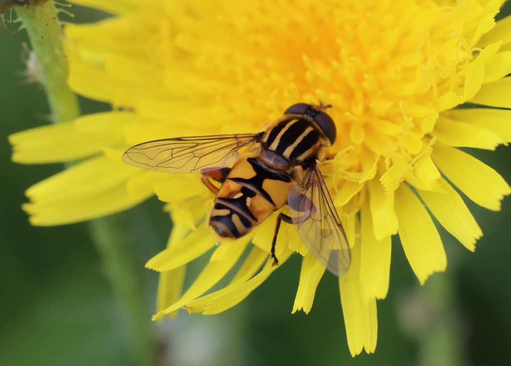 A favourite hoverfly, Helophilus pendulus, prefers habitats close to water. There is a very good chance that this smart insect will be seen sunning itself on a leaf or feeding on one of the many members of the Dandelion family.
