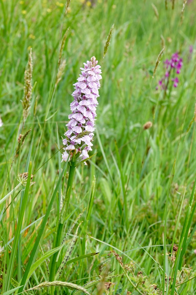 Spotted leaves, but lower petal not noticeably divided. Is it a hybrid or Common Spotted? It’s too pale for Southern Marsh Orchid. I don’t have the answer but am leaning towards Common Spotted Orchid, Dactylorhiza fuchsii.