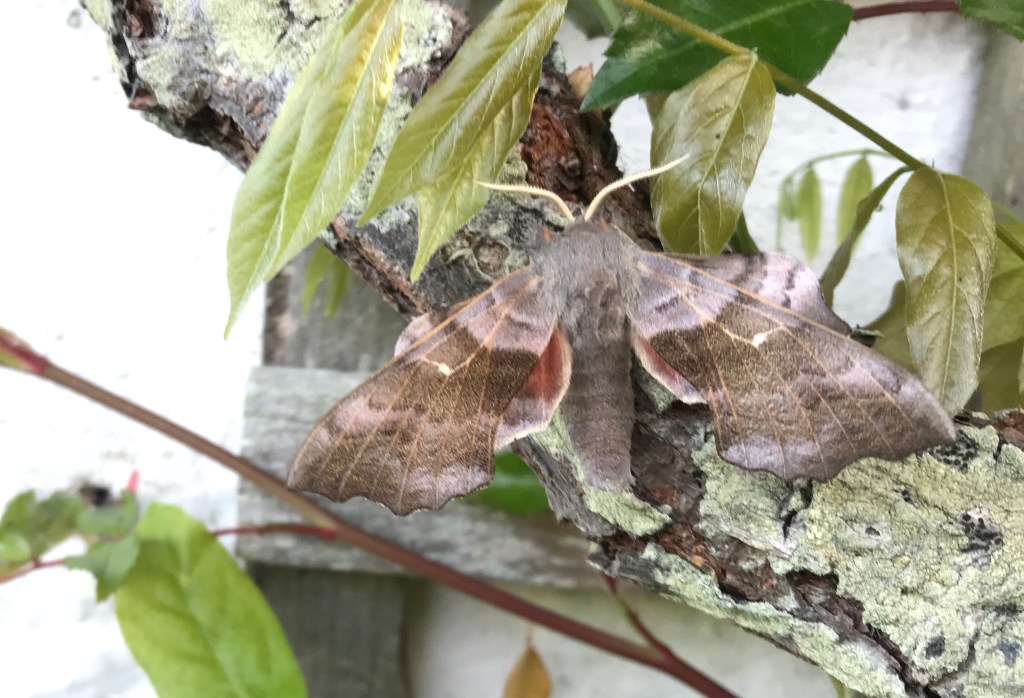 A very fresh Poplar Hawk-moth showing lilac tones and just a little of its burgundy patch on its hindwing. These are normally held forward of the forewings which gives it an unusual appearance.