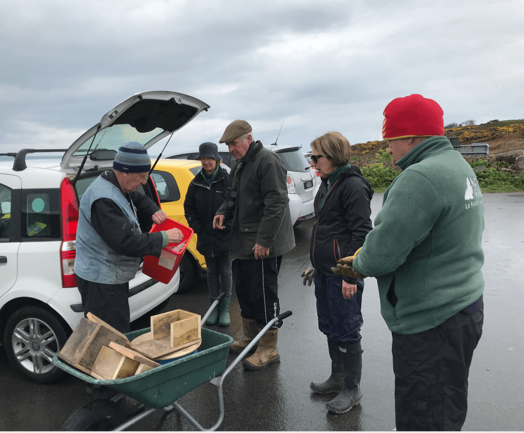 Vic Froome, a long-standing and hands-on enthusiast, has been making model Common Tern, Sterna Hirundo, to put at the top of the shingle on Lihou in the hope that it will encourage these birds to return to a former breeding ground. Last year, about fifteen pairs bred on an islet off the east coast. The boxes in the wheelbarrow will be placed on the shingle and weighted down with pebbles to give chicks cover from predatory gulls.